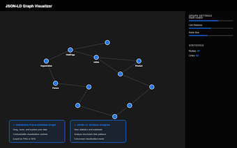 ビジュアライゼーションに加えて、このツールは強力な分析機能を提供し、ユーザーが@typeカウントや@id参照などの統計を表示できるようにします。インタラクティブなキャンバスでは、ユーザーがクリック、ドラッグ、一時停止、ズームを行い、グラフを完全に探索できます。ユーザーはまた、高解像度のPNG画像やSVGファイルとしてビジュアライゼーションをエクスポートできるため、グラフィックデザインアプリケーションで簡単に編集できます。このアドオンは、構造化データを扱うSEO専門家、開発者、データアナリストに特に役立ちます。